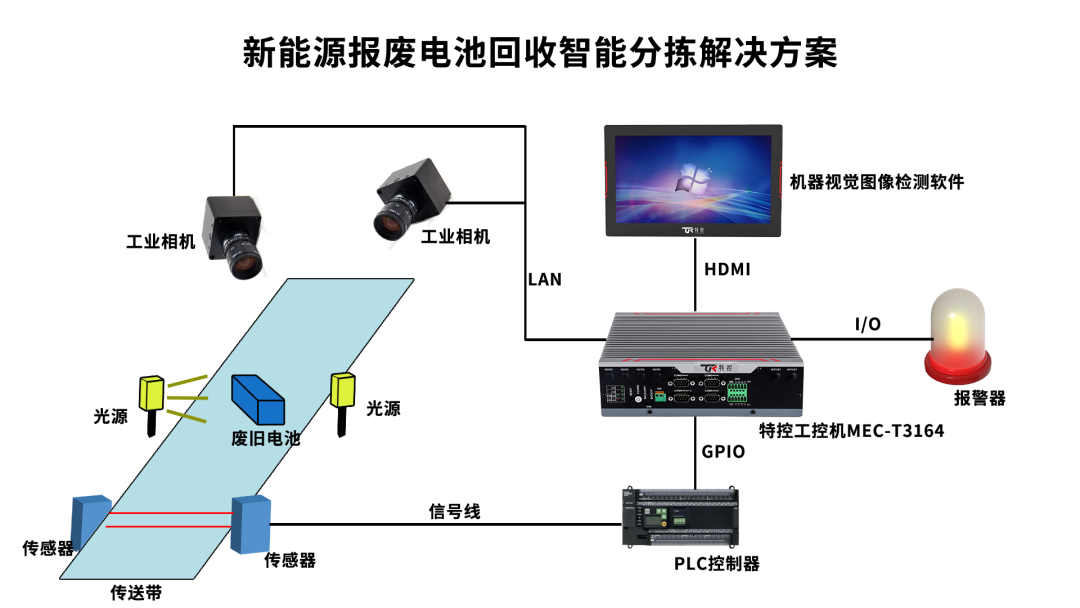 特控MEC-T3164具有超強的計算能力,在電池回收應用場景中,搭載光源、相機和通信模塊等可快速檢測出電池的損壞、老化和容量等問題,實現對電池的分選和識別,為后續的回收和再利用提供了準確的判斷依據,避免了極片,電池材料,貴金屬的混雜,提高了資源利用效率;除此之外,還能收集廢舊電池轉化效率數據,為后期成本分析提供依據。